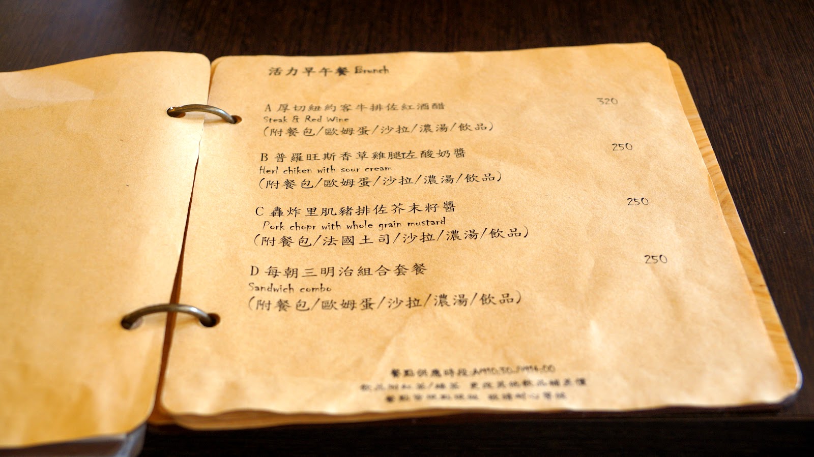 在路邊看著的招牌上的餐點,心裡想著這也許跟一般有販售餐點的咖啡廳會不會沒有什麼兩樣呢。進去坐下之後接待的服務人員親切的介紹下午茶時間現正推出春雞套餐,因著晚上還有飯局選擇了義大利麵與熱狗堡。